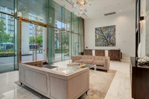 Residents can also enjoy the building’s Aqua Lounge, Sunset Lounge, theater room, fitness center, and private spa and massage rooms.